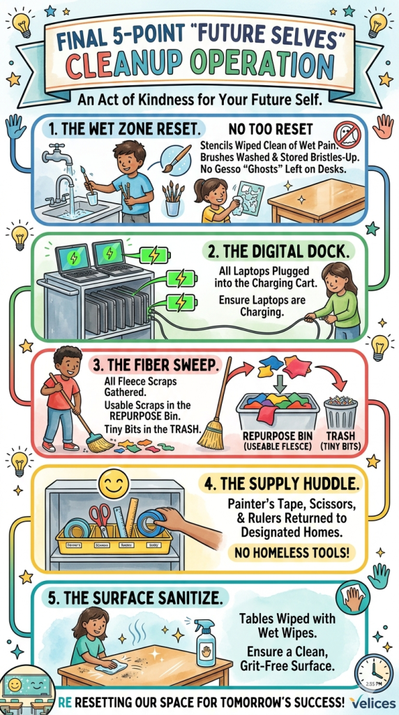 This project is really messy and blankets can easily get dirty and ruined if we aren’t careful. That’s why at this point I decided to create a cleanup protocol to have up on the board. We need to alot a good 10 minutes for this before leaving class at the end of the lesson.