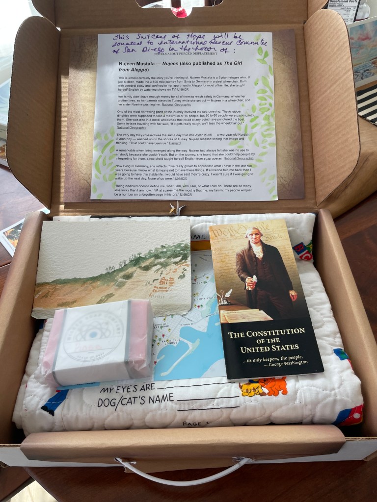 Instead of filling the suitcase with a bunch of inanimate objects, I remember thinking “how are you going to keep it from ending up in the dumpster?” So, I pivoted, and started thinking, “What would be of use in this suitcase?”
