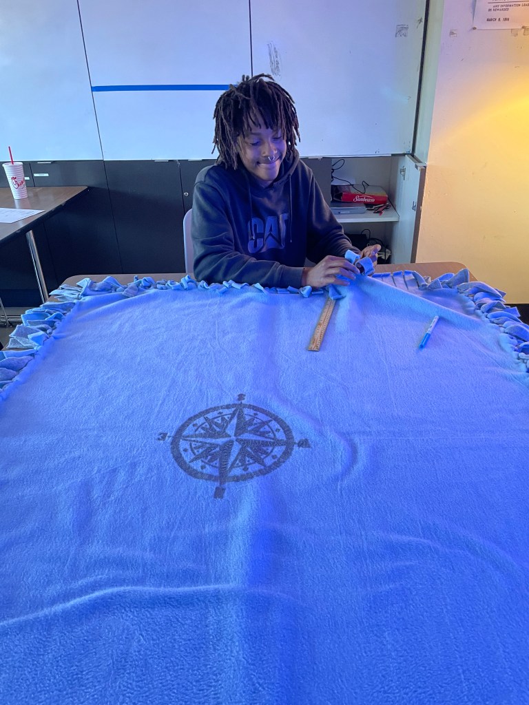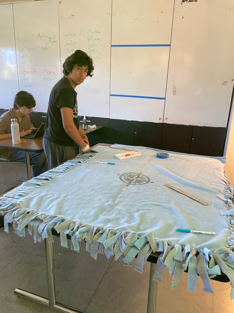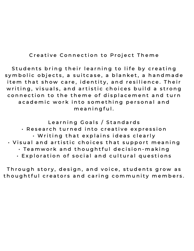 This project has a lot of moving parts and it has revealed to me just how essential clear structures, routines, and systems are for success. With so much going on at once – research, collaboration, suitcase creation, blanket construction, art, writing, community engagement – I am seeing that consistency across all class periods, days, and weeks is critical. Moving forward, each class will follow a predictable schedule that includes norm-setting, individual and collaborative work time, and structured reflection, and clean up time to ensure that all studetns can access the goals of this project.