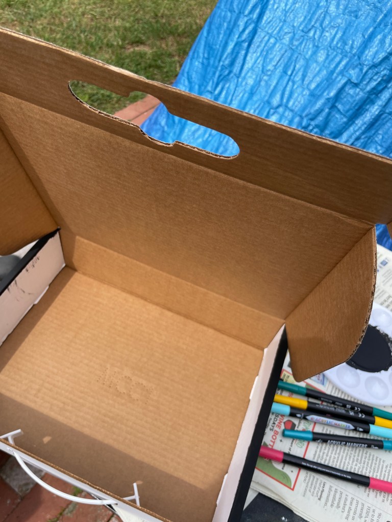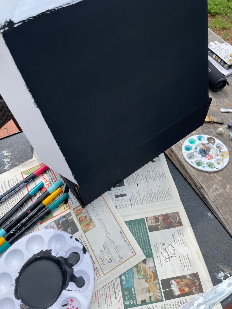 I started by applying black gesso on one side. It’s important to go in the same direction. Let dry. Then go in a cross-hatch direction. Let dry. That way you won’t have streaks on your painting.