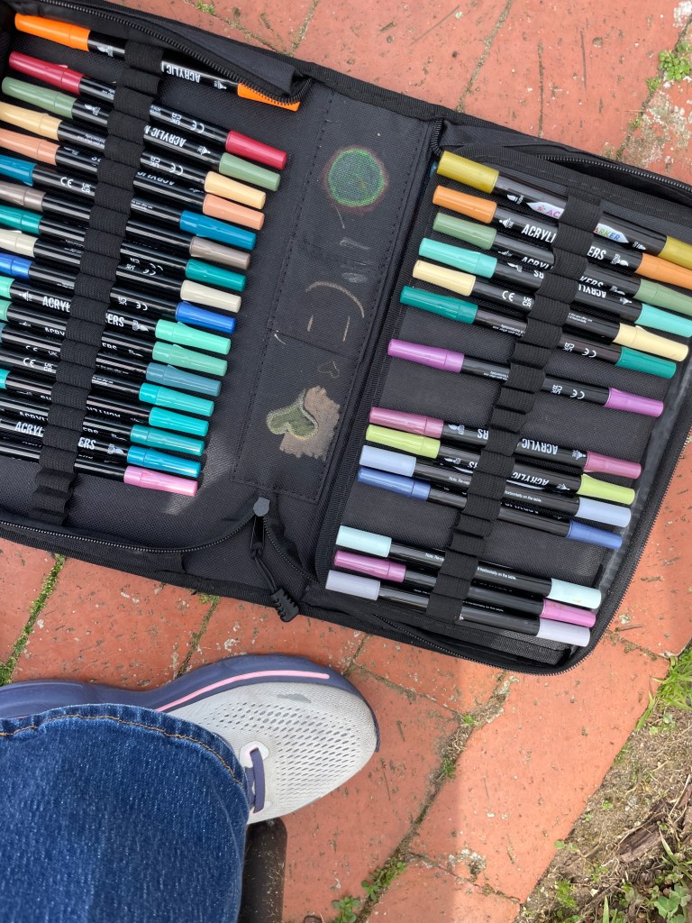 Tracing with white graphite paper onto the black matte surface. Then filling in with acrylic marker pens.