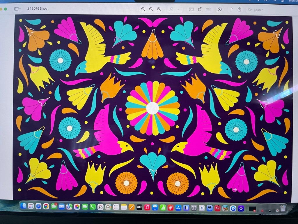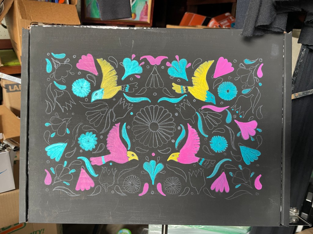 Time to select the reference. I searched “alibreje wallpaper” to find this incredible pattern. I printed it out, and taped it gently onto the dried surface. Students are very familiar with tracing after the Loteria project. They’ll do the same thing with this project, only they will be painting on black with the acrylic marker pens. They will be surprised to see how vibrant and colorful the same markers are.