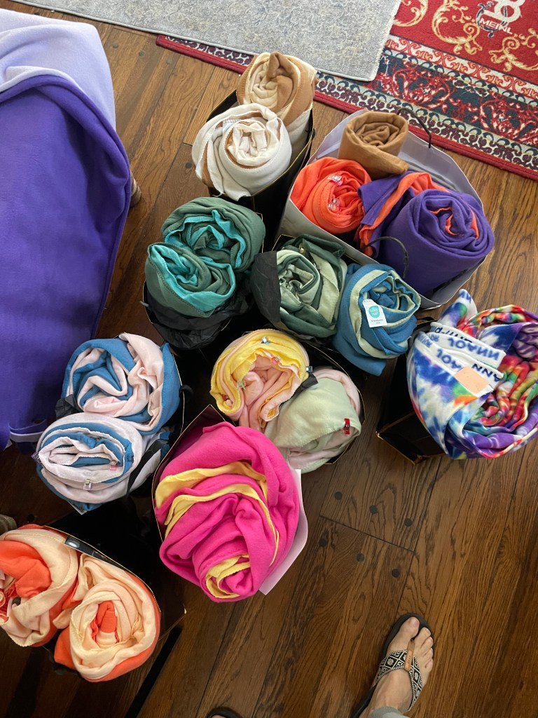 My husband and I went to Barrio Logan to a shop called Material Happiness. I told owner about our project and she donated a bunch of fabric! The fleece was very thin, so I put two pieces together. I started organizing by color theory, then I started to ask, “I wonder what colors Nujeen would pick?” That started the symbolic colors of a simple no-sew blanket.