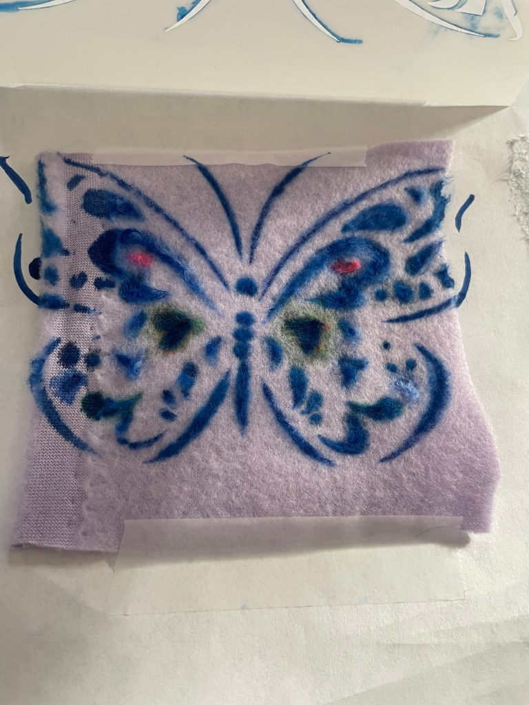 In the new iteration, I decided to try fabric marker with fine tip instead of painting on the fleece.