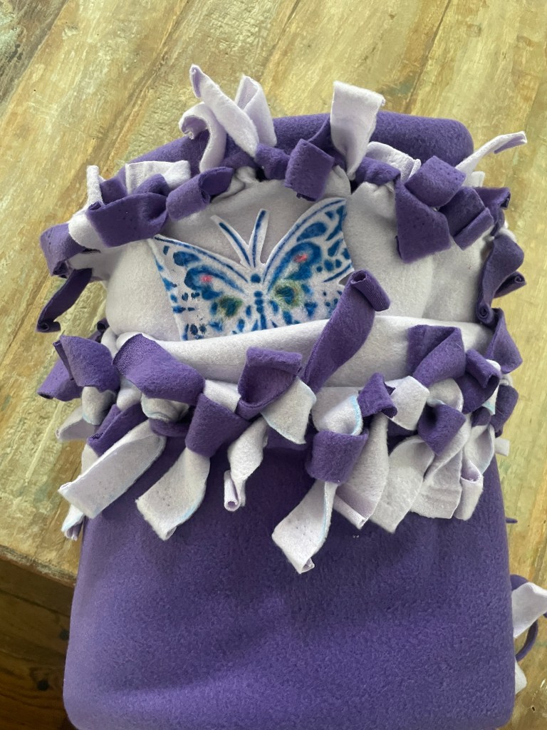 I practiced on a piece of scrap fleece that was removed off all four corners of the no-sew blanket. From that came the realization that we needed a separate station just for painting fleece and practicing what we’re going to paint. I am still learning what works best with painting. I think the pens are much better for details. And they really show up nicely on the lighter colors, not at all on the darker colors as I had hoped.