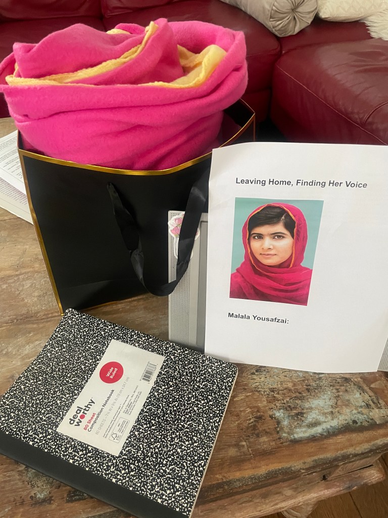 So, I kept going with the theme. Iteration #3: Here’s Malala’s 2 page narrative, blanket, and a notebook symbolizing her dedication to education.