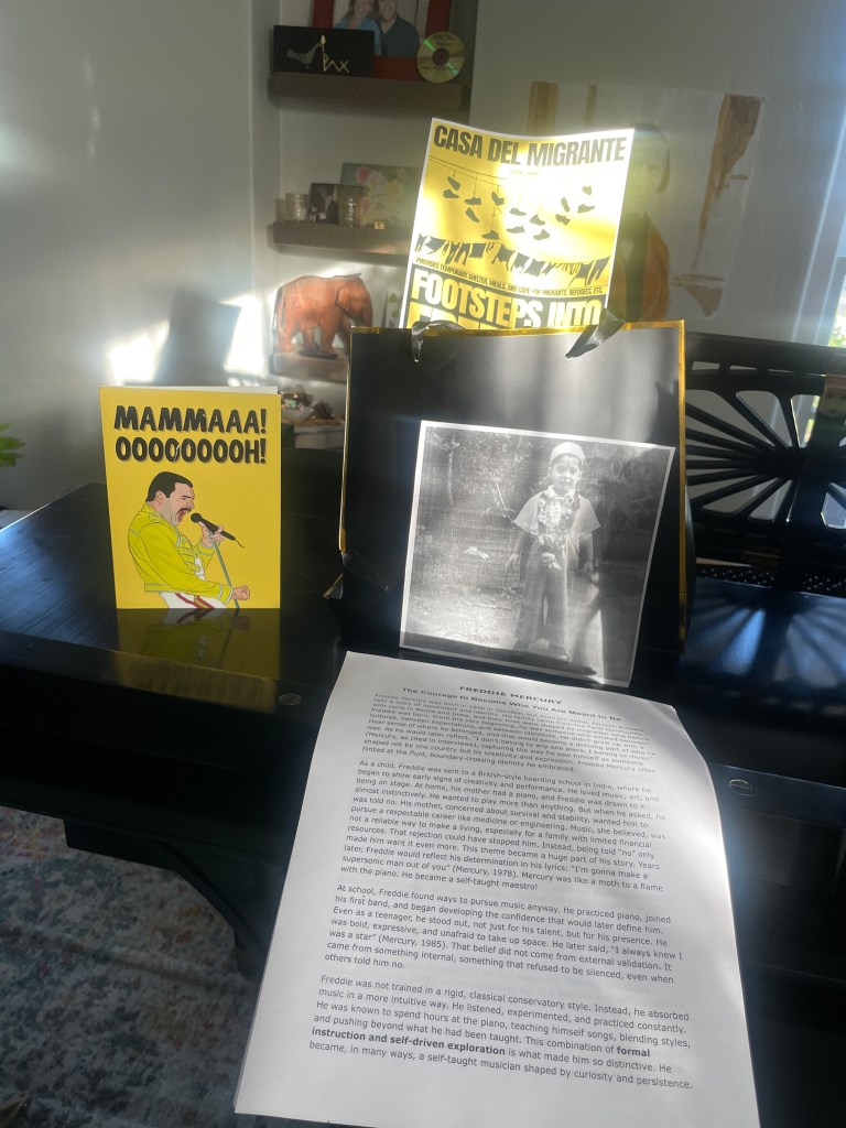 Then, I realized my students had the skills to create really incredible awareness campaigns for a relief organization that they care about or want to know more about. Here is a flyer one of my students made for Casa del Migrante, a refugee shelter in Tijuana, Mexico. This Freddie Mercury themed yellow and black fleece blanket will be donated there in his memory. Freddie Mercury (born Farrokh Bulsara) was forced to leave his home in Zanzibar due to political violence. He fled with his family to India, and ultimately to England where he shed his name and became the legendary Freddie Mercury.