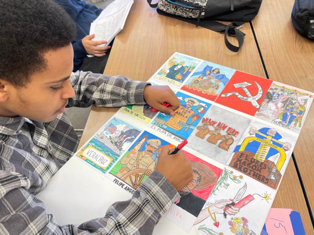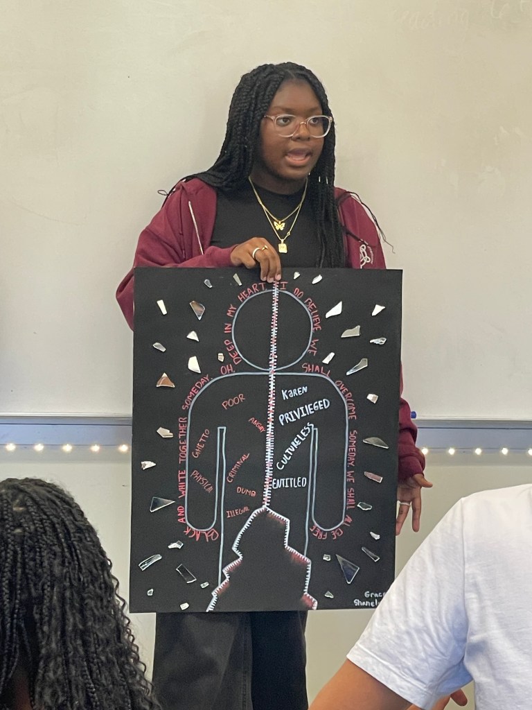 Students created graffiti boards using original or selected lyrics to express a social justice issue they felt strongly about, combining visual art with written voice. Through this process, they explored how art can function as a form of resistance and advocacy, using creative expression to communicate messages of justice, identity, and change.