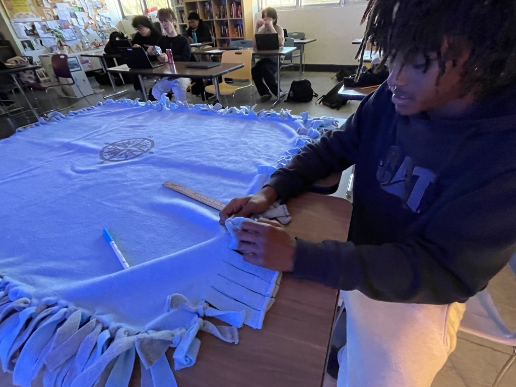 While students are working on researching relief organizations, others are carefully creating no-sew blankets.