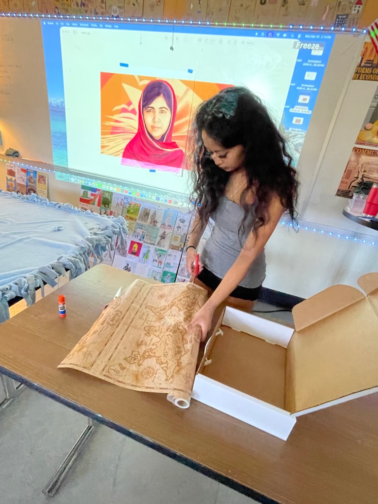 Students are currently engaged in a project-based exploration of global displacement by researching real individuals and creating symbolic suitcases that represent identity, resilience, and lived experience. Through storytelling, art, and public exhibition, students position themselves as authors of change, using their work to elevate human stories and foster empathy, awareness, and social responsibility.